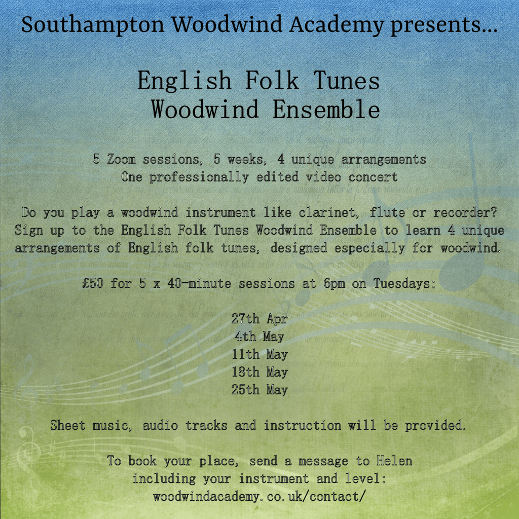 The English Folk Tunes Woodwind Ensemble ran in Spring 2021 via Zoom. By the end of the course, each participant was able to record a video of their part which was then professionally edited into an ensemble piece to share with family and friends. We hope you enjoy watching the final result!